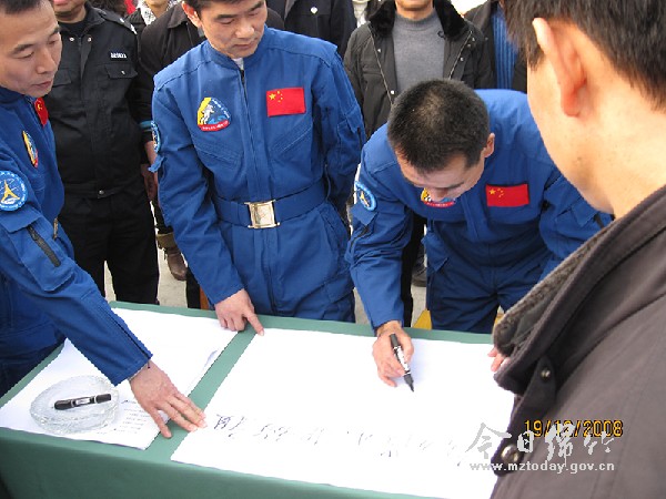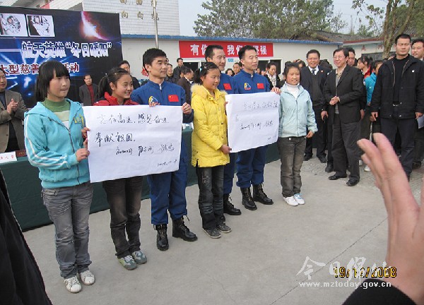孝德中学老师朱永娟见证了巡访活动的全过程。12年后,当她再次翻开那些珍藏的合照,仍难掩激动之情。当天清晨,天空才露出鱼肚白,齐福中学(现已并入孝德中学)的师生和周边群众就已经守候在校门口,翘首企盼三名航天英雄的到来。“孩子们都还好吗?吃住和学习都还习惯吗?”“宝贝,我们都要有理想,然后要锻炼身体、好好学习。”巡访现场,航天英雄关切地询问孩子们的生活学习情况,还现场在书上签名,写上“志存高远 感恩奋进”“努力学习 报效祖国”的励志语,并将这一本本象征着“希望”的航天书籍和各界捐赠过冬的棉衣送到孩子们手中。一句句平凡而有力量的鼓励语,一件件暖心的礼物,让学校师生感受到春日般的温暖,激励着孩子向阳生长。 “活动临近尾声,师生们久久不愿散开,依然围在航天员的身边,近距离与航天员交流,聆听‘飞天’故事,全体学生一边大声唱着‘感恩的心’,一边用手比画着‘心’,感谢航天员叔叔的关心。”朱永娟介绍道,震后第二年,由于教学资源整合,齐福中学并入到孝德中学。合并后,齐福中学亦将伴随师生共同成长的“航天精神”带入到了孝德中学,并融入到日常教育教学中。