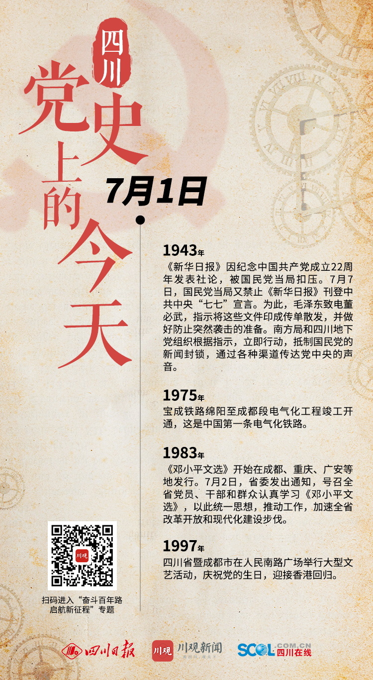 1943年 《新华日报》因庆祝中国共产党成立22周年发表社论,被国民党当局扣压。7月7日,国民党当局又禁止《新华日报》刊登中共中央“七七”宣言。为此,毛泽东致电董必武,指示将这些文件印成传单散发,并做好防止突然袭击的准备。南方局和四川地下党组织根据指示,立即行动,抵制国民党的新闻封锁,通过各种渠道传达党中央的声音。 1975年 宝成铁路绵阳至成都段电气化工程竣工开通,这是中国第一条电气化铁路。 1983年《邓小平文选》开始在成都、重庆、广安等地发行。7月2日,省委发出通知,号召全省党员、干部和群众认真学习《邓小平文选》,以此统一思想,推动工作,加速全省改革开放和现代化建设步伐。 1997年 四川省暨成都市在人民南路广场举行大型文艺活动,庆祝党的生日,迎接香港回归。 |
