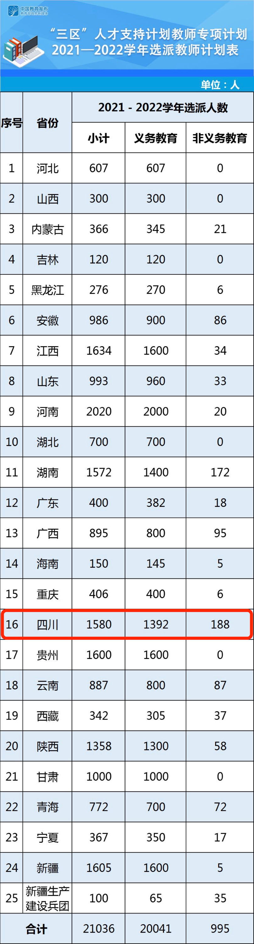 日前,教育部、财政部发布《关于做好2021年“三区”人才支持计划教师专项计划有关实施工作的通知》。2021—2022学年全国计划选派21036名教师,其中四川有1580名。 计划实施范围有哪些?具体选派要求和形式是什么? 一起来看↓↓↓ 一、准确把握政策要点 (一)受援范围。主要是脱贫地区(原国家确定的连片特困地区、国家扶贫开发工作重点县、省级扶贫开发工作重点县及各地确定的其他深度贫困地区、新疆生产建设兵团困难团场),重点向国家乡村振兴重点帮扶县、原“三区三州”等深度贫困地区倾斜。 (二)选派数量。2021—2022学年全国计划选派21036名教师,其中义务教育阶段计划选派20041名,非义务教育阶段计划选派995名。各项目省要优化省内名额分配,加大跨县跨地市选派力度,充分调动省会城市、中心城市的优质资源,加强对所辖原深度贫困县支持。各项目省(区、市)和新疆生产建设兵团选派名额详见下图。