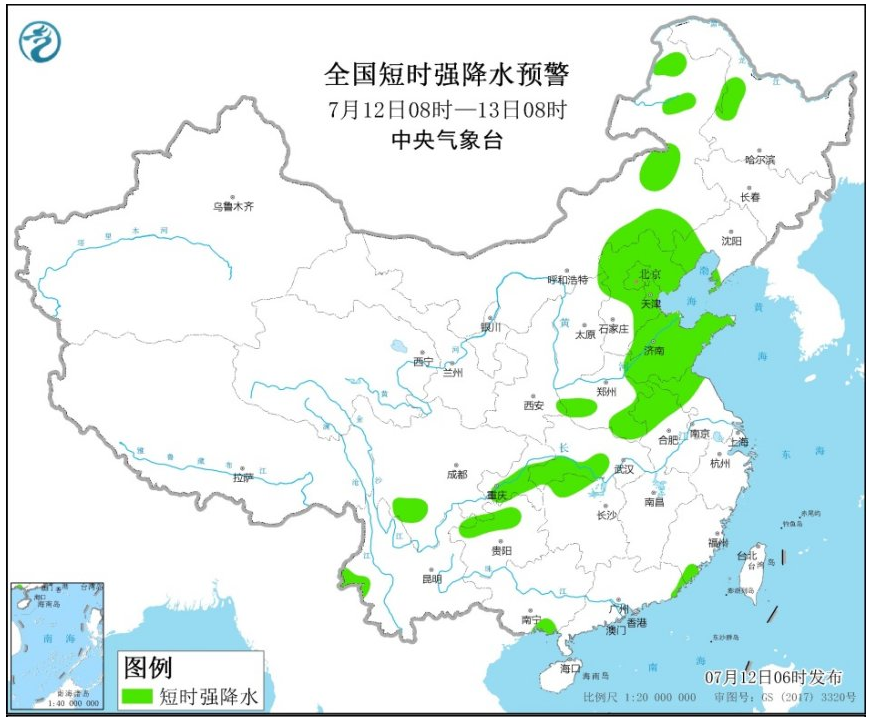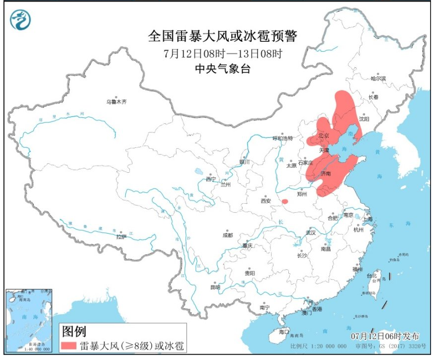 中央气象台7月12日06时继续发布强对流天气黄色预警: 预计7月12日08时至13日08时,内蒙古中东部、黑龙江西部、辽宁南部和西部、河北、北京、天津、山东、河南南部和西部、安徽北部、江苏北部、湖北南部、湖南北部、四川南部、重庆中西部、贵州北部、云南西南部、广西东南部沿海等地的部分地区将有短时强降水天气,小时雨量30-60毫米,局地可达80毫米以上;内蒙古东南部、辽宁中西部和南部、河北北部、北京、天津、山东、河南北部和东部、江苏北部等地的部分地区将有8-10级雷暴大风或冰雹天气, 局地风力可达11级以上。