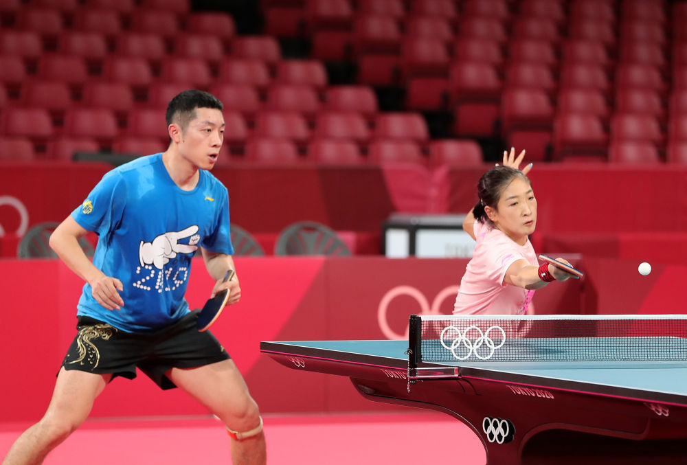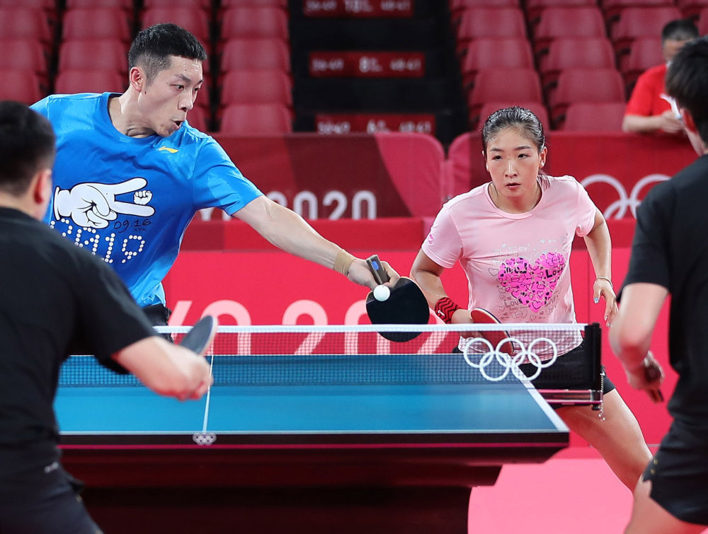 ↑刘诗雯(右)和许昕在训练中。