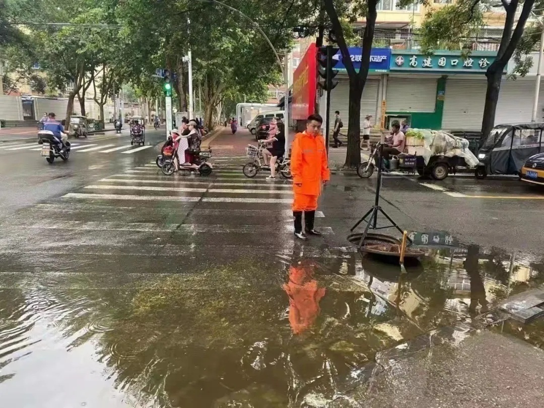 工农路师范街交口排水井盖打开 城管工作人员在旁边值守↓