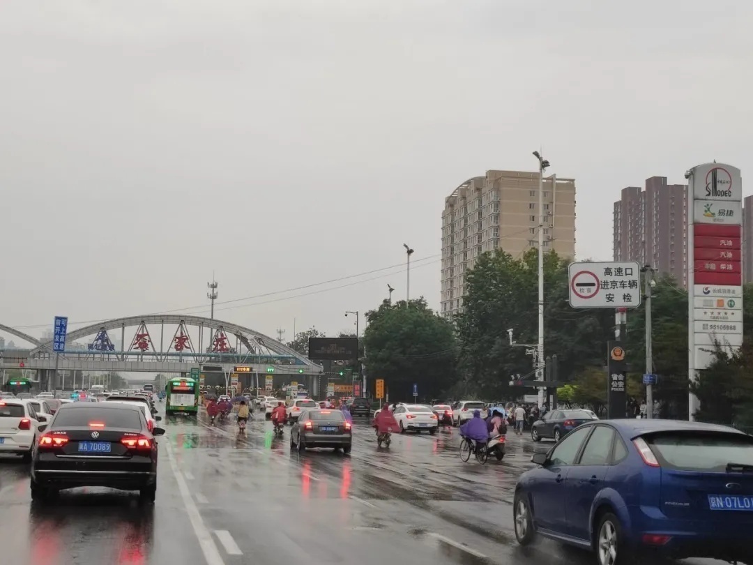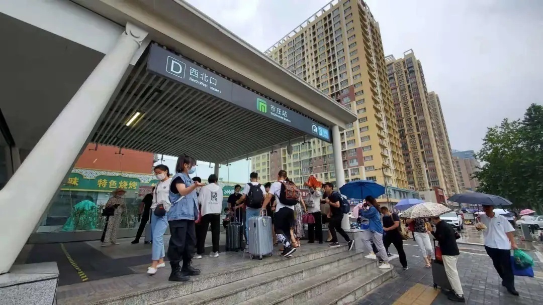 【8:14】 中华大街北向南整体通行缓慢 目前新华区雨势较小 建议市民可以选择地铁出行 图为地铁三号线市庄站