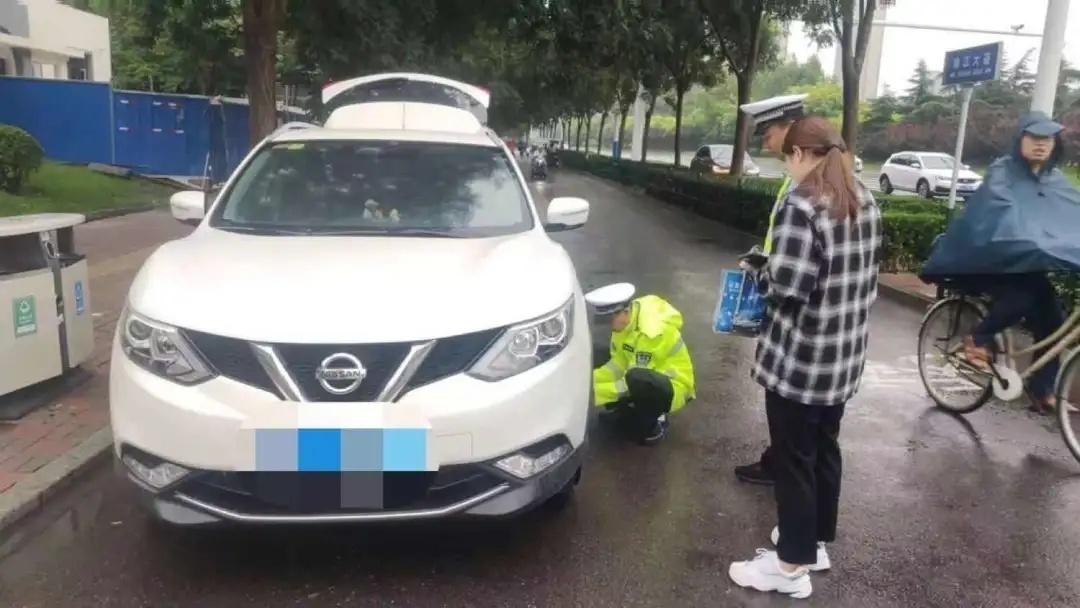 【8:19】 天山大街珠江路口 交警在早高峰冒雨 为求助人员(车辆爆胎)更换备胎