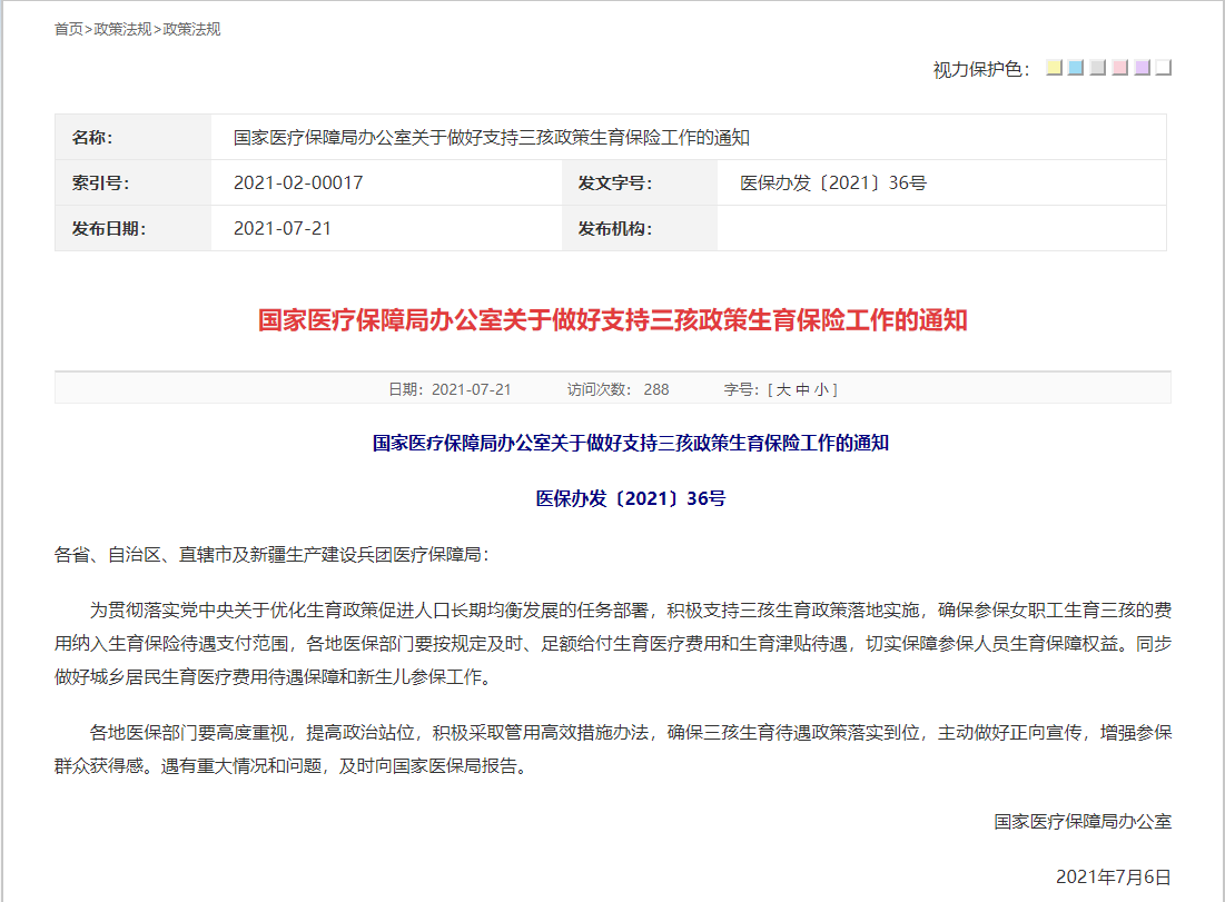 近日,国家医疗保障局办公室发布关于做好支持三孩政策生育保险工作的通知,具体通知如下: 各省、自治区、直辖市及新疆生产建设兵团医疗保障局: 为贯彻落实党中央关于优化生育政策促进人口长期均衡发展的任务部署,积极支持三孩生育政策落地实施,确保参保女职工生育三孩的费用纳入生育保险待遇支付范围,各地医保部门要按规定及时、足额给付生育医疗费用和生育津贴待遇,切实保障参保人员生育保障权益。同步做好城乡居民生育医疗费用待遇保障和新生儿参保工作。 各地医保部门要高度重视,提高政治站位,积极采取管用高效措施办法,确保三孩生育待遇政策落实到位,主动做好正向宣传,增强参保群众获得感。遇有重大情况和问题,及时向国家医保局报告。