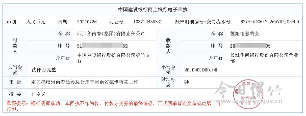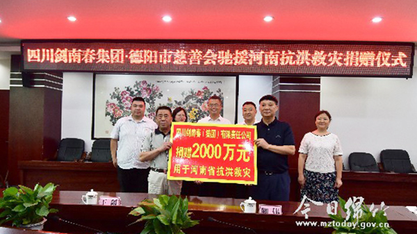 7月26日,四川剑南春集团有限责任公司官方宣布,公司通过德阳市慈善会向遭受暴雨灾害的河南省捐助救灾款项2000万元整。德阳市副市长卿伟,德阳市民政局、德阳市慈善会、四川剑南春集团有限责任公司相关负责人参加捐赠仪式。