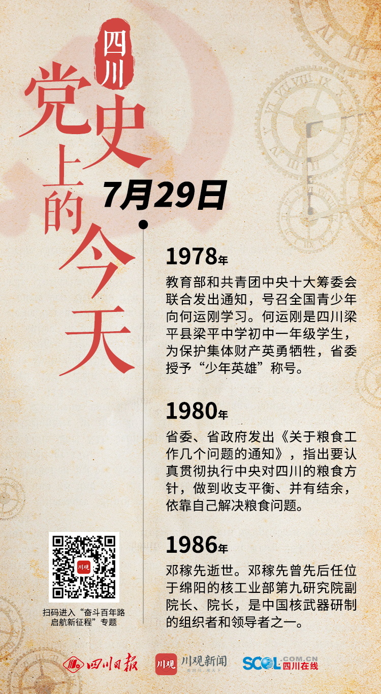 1978年 教育部和共青团中央十大筹委会联合发出通知,号召全国青少年向何运刚学习。何运刚是四川梁平县梁平中学初中一年级学生,为保护集体财产英勇牺牲,省委授予“少年英雄”称号。 1980年 省委、省政府发出《关于粮食工作几个问题的通知》,指出要认真贯彻执行中央对四川的粮食方针,做到收支平衡、并有结余,依靠自己解决粮食问题。 1986年 邓稼先逝世。邓稼先曾先后任位于绵阳的核工业部第九研究院副院长、院长,是中国核武器研制的组织者和领导者之一。 来源:川观新闻 |