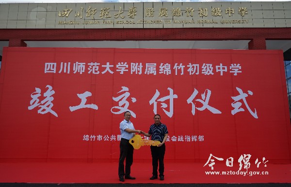 7月28日下午,四川师范大学附属绵竹初级中学竣工交付仪式举行。市人大常委会党组书记、主任、市公共服务重大项目建设会战指挥部指挥长张映琪出席仪式。 交付仪式上,张映琪将代表学校竣工的金钥匙交付给四川师范大学附属绵竹初级中学校长罗祥勇手中,并对学校顺利竣工表示祝贺。 据了解,四川师范大学附属绵竹初级中学项目是我市“六大会战”重点项目,于2019年5月正式开工,历时26个月正式交付,将于今年9月1日正式迎来第一届新生报到。