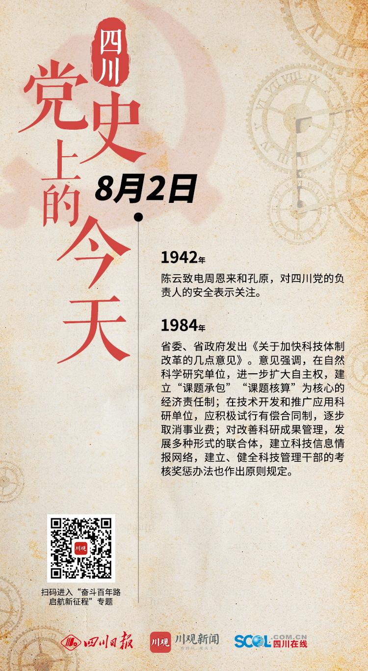 1942年 陈云致电周恩来和孔原,对四川党的负责人的安全表示关注。 1984年 省委、省政府发出《关于加快科技体制改革的几点意见》。意见强调,在自然科学研究单位,进一步扩大自主权,建立“课题承包”“课题核算”为核心的经济责任制;在技术开发和推广应用科研单位,应积极试行有偿合同制,逐步取消事业费;对改善科研成果管理,发展多种形式的联合体,建立科技信息情报网络,建立、健全科技管理干部的考核奖惩办法也作出原则规定。 (川观新闻记者 袁婧 整理)