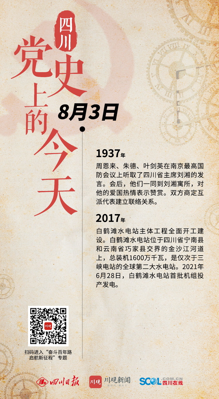 1937年 周恩来、朱德、叶剑英在南京最高国防会议上听取了四川省主席刘湘的发言。会后,他们一同到刘湘寓所,对他的爱国热情表示赞赏。双方商定互派代表建立联络关系。 2017年 白鹤滩水电站主体工程全面开工建设。白鹤滩水电站位于四川省宁南县和云南省巧家县交界的金沙江河道上,总装机1600万千瓦,是仅次于三峡电站的全球第二大水电站。2021年6月28日,白鹤滩水电站首批机组投产发电。 来源:川观新闻 |