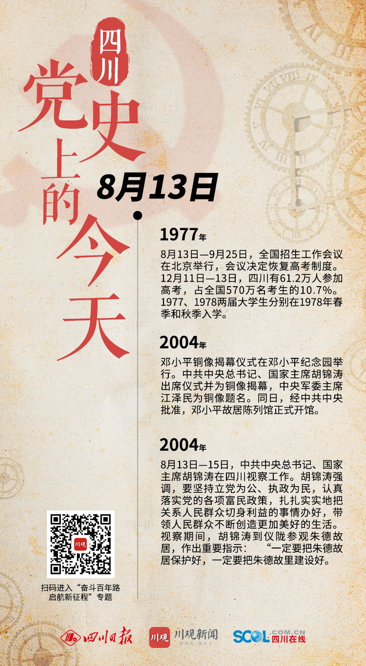 1977年 8月13日—9月25日,全国招生工作会议在北京举行,会议决定恢复高考制度。12月11日—13日,四川有61.2万人参加高考,占全国570万名考生的10.7%。1977、1978两届大学生分别在1978年春季和秋季入学。 2004年 邓小平铜像揭幕仪式在邓小平纪念园举行。中共中央总书记、国家主席胡锦涛出席仪式并为铜像揭幕,中央军委主席江泽民为铜像题名。同日,经中共中央批准,邓小平故居陈列馆正式开馆。 2004年 8月13日—15日,中共中央总书记、国家主席胡锦涛在四川视察工作。胡锦涛强调,要坚持立党为公、执政为民,认真落实党的各项富民政策,扎扎实实地把关系人民群众切身利益的事情办好,带领人民群众不断创造更加美好的生活。视察期间,胡锦涛到仪陇参观朱德故居,作出重要指示: “一定要把朱德故居保护好,一定要把朱德故里建设好。 (川观新闻记者 袁婧 整理)