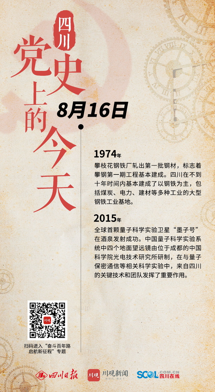1974年 攀枝花钢铁厂轧出第一批钢材,标志着攀钢第一期工程基本建成。四川在不到十年时间内基本建成了以钢铁为主,包括煤炭、电力、建材等多种工业的大型钢铁工业基地。 2015年 全球首颗量子科学实验卫星“墨子号”在酒泉发射成功。中国量子科学实验系统中四个地面望远镜由位于成都的中国科学院光电技术研究所研制,在与量子保密通信等相关科学实验中,来自四川的关键技术和团队发挥了重要作用。 (川观新闻记者 袁婧 整理)