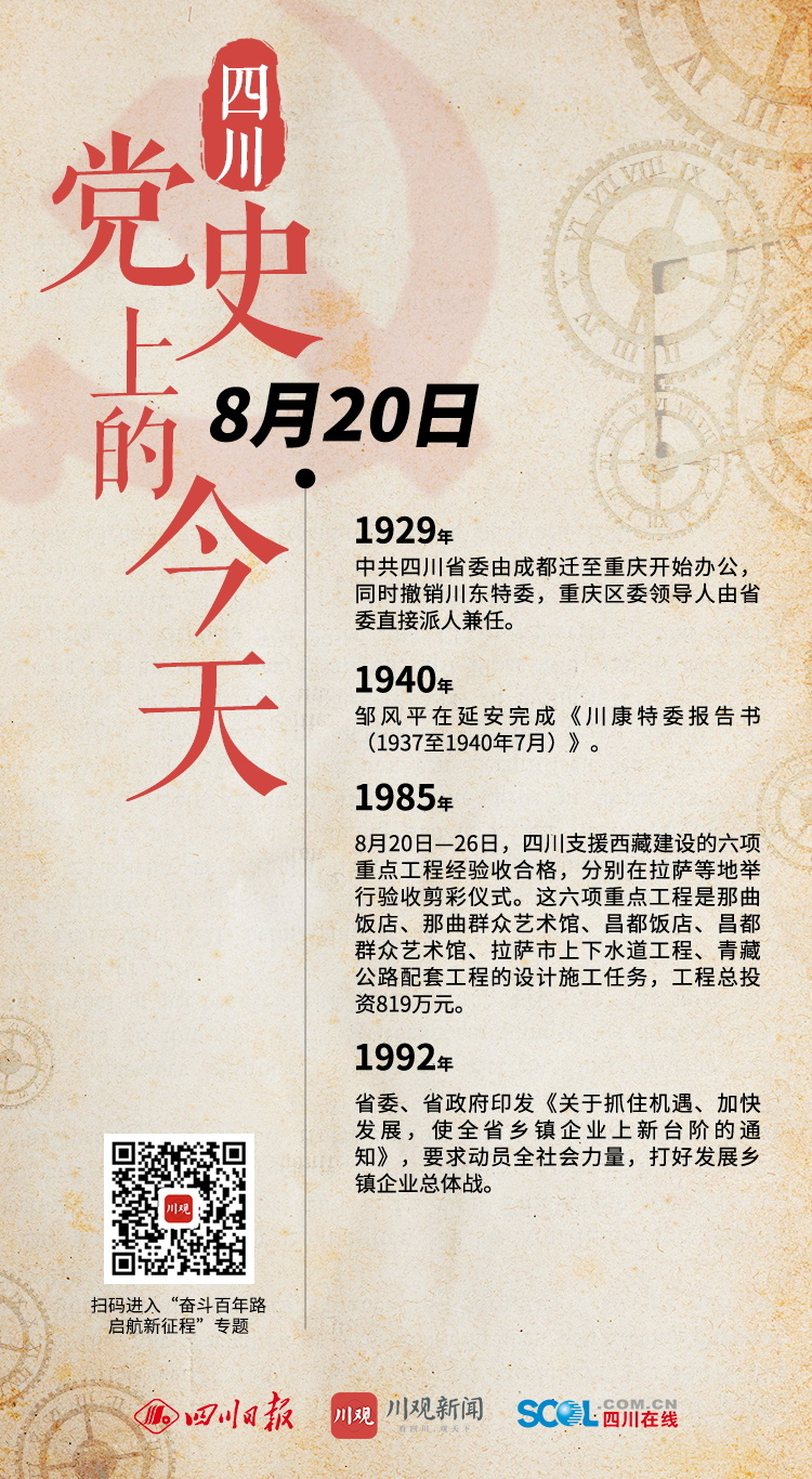 1929年 中共四川省委由成都迁至重庆开始办公,同时撤销川东特委,重庆区委领导人由省委直接派人兼任。 1940年 邹风平在延安完成《川康特委报告书(1937至1940年7月)》。 1985年 8月20日—26日,四川支援西藏建设的六项重点工程经验收合格,分别在拉萨等地举行验收剪彩仪式。这六项重点工程是那曲饭店、那曲群众艺术馆、昌都饭店、昌都群众艺术馆、拉萨市上下水道工程、青藏公路配套工程的设计施工任务,工程总投资819万元。 1992年 省委、省政府印发《关于抓住机遇、加快发展,使全省乡镇企业上新台阶的通知》,要求动员全社会力量,打好发展乡镇企业总体战。 (川观新闻记者 袁婧 整理)