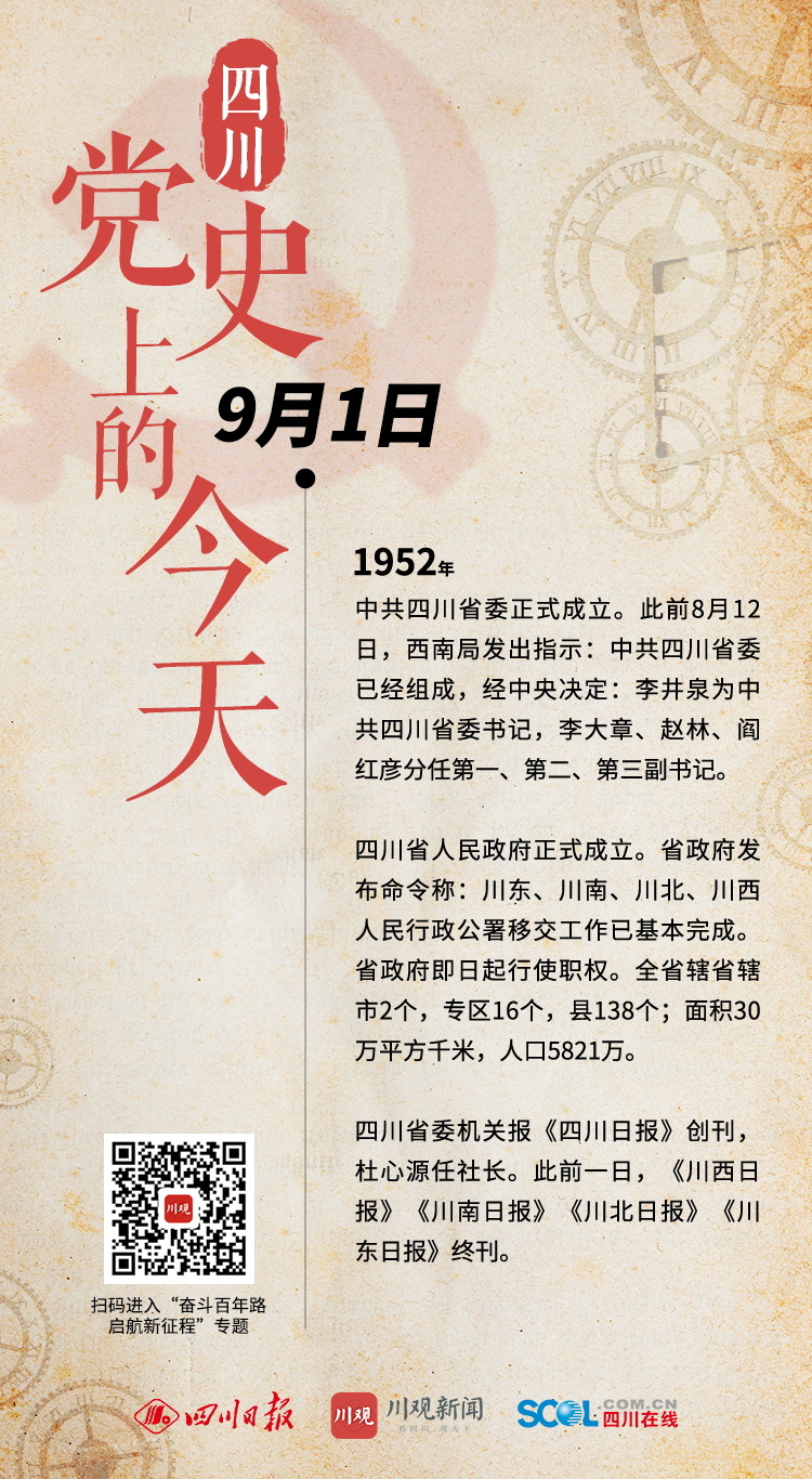 中共四川省委正式成立。此前8月12日,西南局发出指示:中共四川省委已经组成,经中央决定:李井泉为中共四川省委书记,李大章、赵林、阎红彦分任第一、第二、第三副书记。 四川省人民政府正式成立。省政府发布命令称:川东、川南、川北、川西人民行政公署移交工作已基本完成。省政府即日起行使职权。全省辖省辖市2个,专区16个,县138个;面积30万平方千米,人口5821万。 四川省委机关报《四川日报》创刊,杜心源任社长。此前一日,《川西日报》《川南日报》《川北日报》《川东日报》终刊。 来源:川观新闻 |