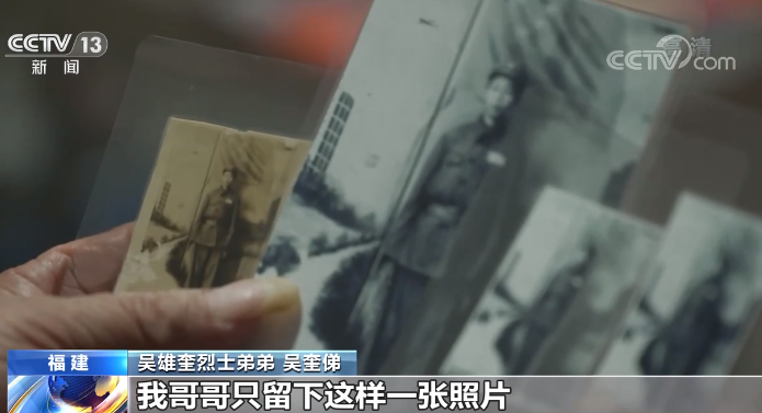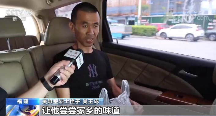 吴雄奎烈士弟弟 吴奎俤:我哥哥只留下这样一张照片,别的都没有了。 由于身体原因,吴奎俤无法亲自到沈阳参加仪式,只能由他的儿子,吴雄奎烈士的侄子代为前往沈阳。记者注意到吴雄奎烈士侄子吴玉成抱着一包橄榄。
