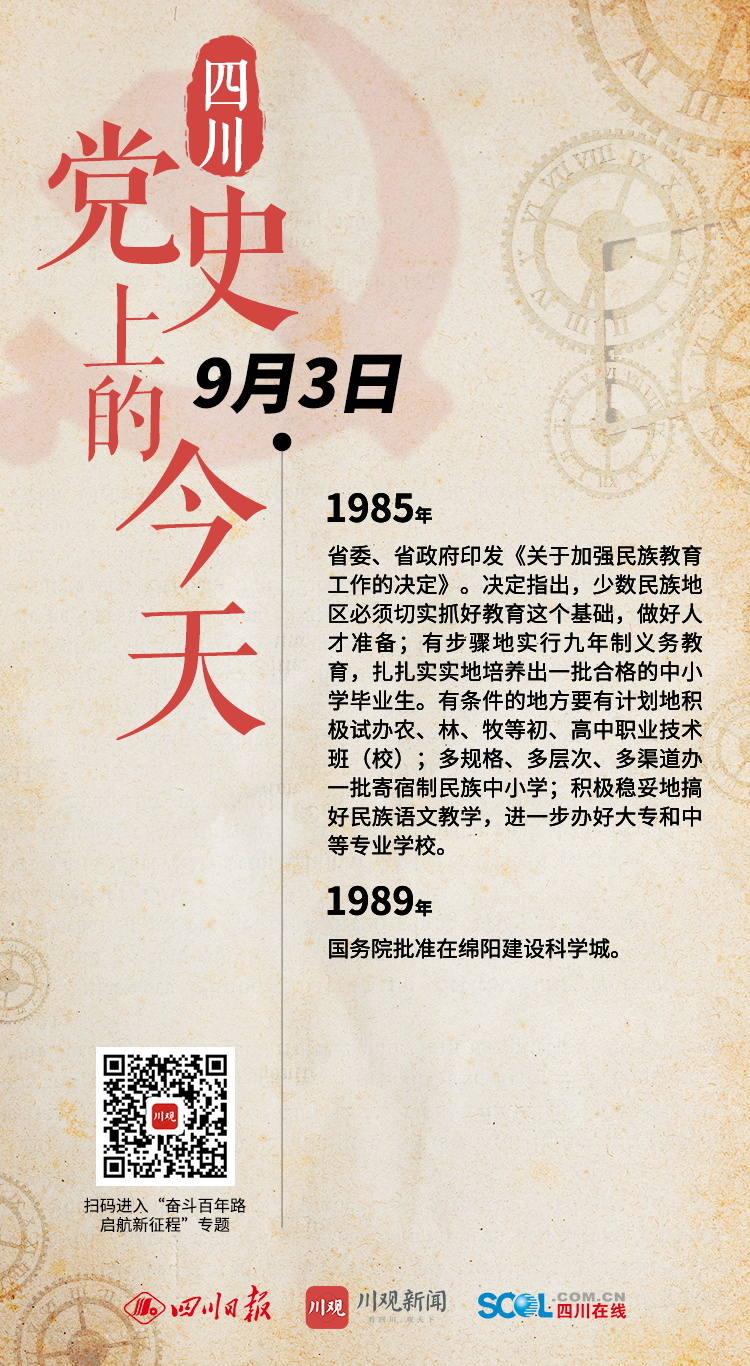 1985年 省委、省政府印发《关于加强民族教育工作的决定》。决定指出,少数民族地区必须切实抓好教育这个基础,做好人才准备;有步骤地实行九年制义务教育,扎扎实实地培养出一批合格的中小学毕业生。有条件的地方要有计划地积极试办农、林、牧等初、高中职业技术班(校);多规格、多层次、多渠道办一批寄宿制民族中小学;积极稳妥地搞好民族语文教学,进一步办好大专和中等专业学校。 1989年 国务院批准在绵阳建设科学城。 来源:川观新闻 |