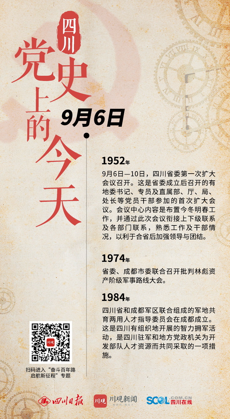 1952年 9月6日—10日,四川省委第一次扩大会议召开。这是省委成立后召开的有地委书记、专员及直属部、厅、局、处长等党员干部参加的首次扩大会议。会议中心内容是布置今冬明春工作,并通过此次会议衔接上下级联系及各部门联系,熟悉工作及干部情况,以利于合省后加强领导与团结。 1974年 省委、成都市委联合召开批判林彪资产阶级军事路线大会。 1984年 四川省和成都军区联合组成的军地共育两用人才指导委员会在成都成立。这是四川有组织地开展的智力拥军活动,是四川驻军和地方党政机关为开发部队人才资源而共同采取的一项措施。 (川观新闻记者 袁婧 整理)