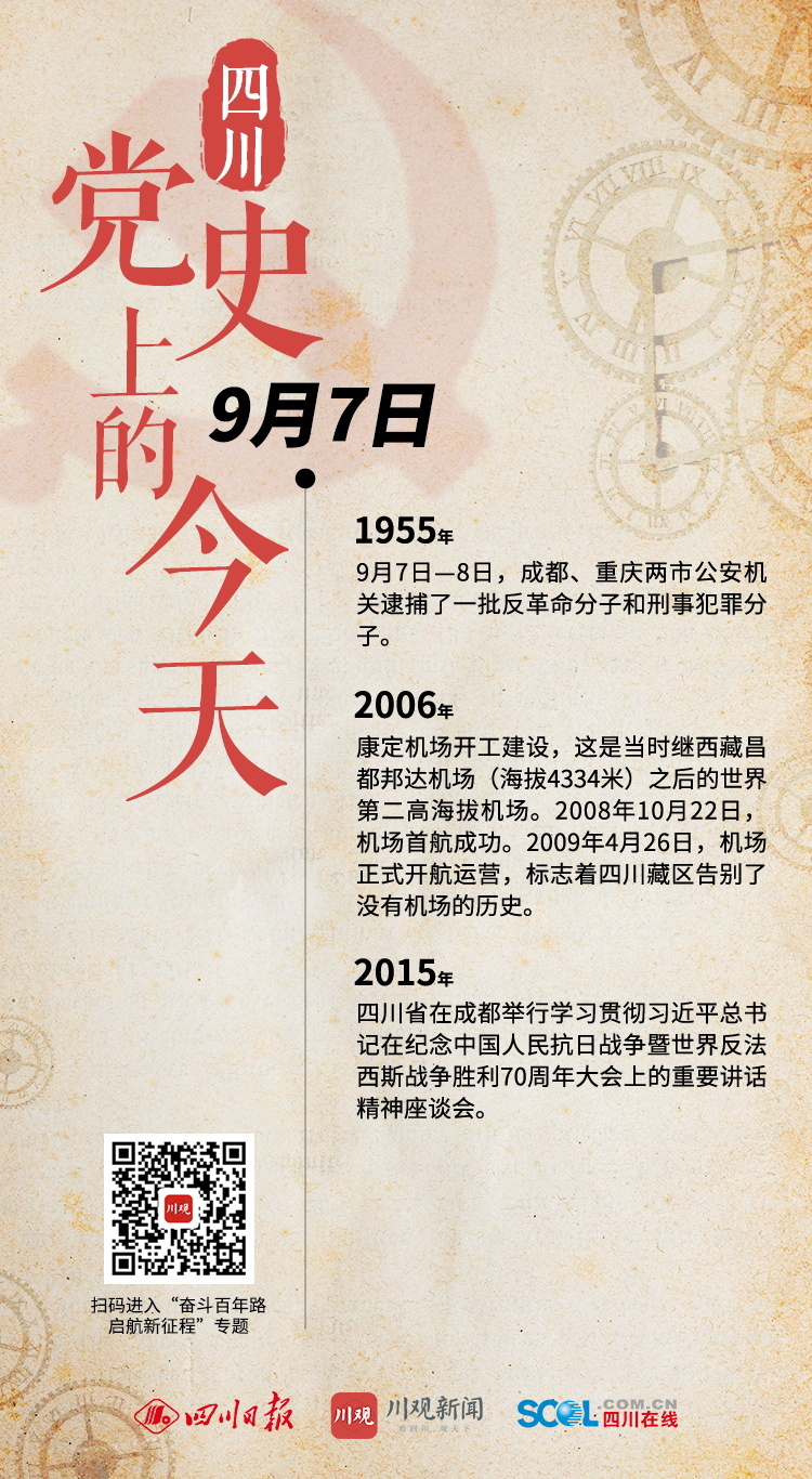 1955年 9月7日—8日,成都、重庆两市公安机关逮捕了一批反革命分子和刑事犯罪分子。 2006年 康定机场开工建设,这是当时继西藏昌都邦达机场(海拔4334米)之后的世界第二高海拔机场。2008年10月22日,机场首航成功。2009年4月26日,机场正式开航运营,标志着四川藏区告别了没有机场的历史。 2015年 四川省在成都举行学习贯彻习近平总书记在纪念中国人民抗日战争暨世界反法西斯战争胜利70周年大会上的重要讲话精神座谈会。 来源:川观新闻 |