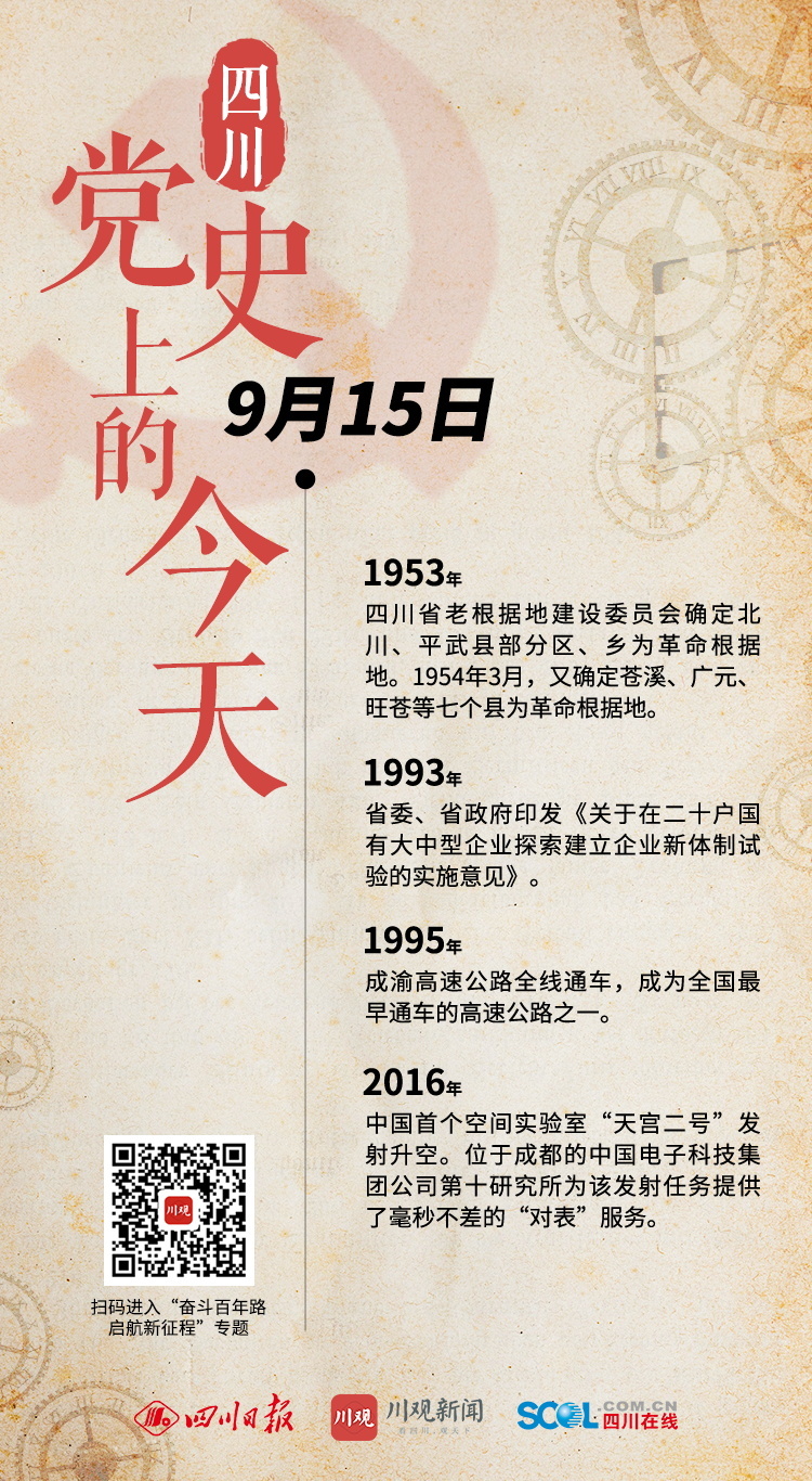 1953年 四川省老根据地建设委员会确定北川、平武县部分区、乡为革命根据地。1954年3月,又确定苍溪、广元、旺苍等七个县为革命根据地。 1993年 省委、省政府印发《关于在二十户国有大中型企业探索建立企业新体制试验的实施意见》。 1995年 成渝高速公路全线通车,成为全国最早通车的高速公路之一。 2016年 中国首个空间实验室“天宫二号”发射升空。位于成都的中国电子科技集团公司第十研究所为该发射任务提供了毫秒不差的“对表”服务。 (川观新闻记者 袁婧 整理)