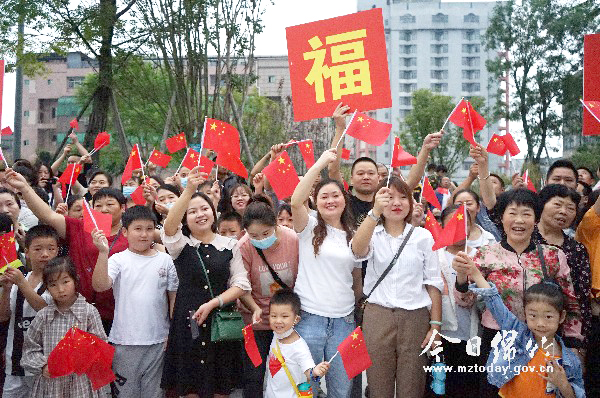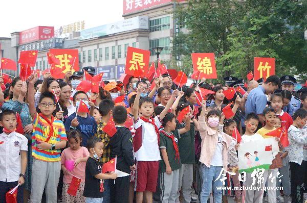 当天,绵竹中心广场上红旗飘扬,繁花似锦,洋溢着喜庆的节日氛围。早上7点30分,前来参加升旗仪式的社会各界代表和群众陆续汇聚在升旗台前,排起整齐的队列,静静等待着升旗时刻的到来。当《我和我的祖国》《歌唱祖国》音乐声响起,大家挥动手中的五星红旗,高声歌唱,现场形成一片红色的海洋。