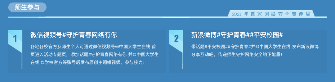 03 网络安全主题线上短视频接力 10月11日至21日,教育部指导中国大学生在线、腾讯微信共同发起“守护青春 网络有你”线上视频号话题,各地各校师生可通过微信视频号@中国大学生在线 首页进入活动专题页,添加话题#守护青春网络有你,并@中国大学生在线 @微信派 @学校官方账号后发布原创主题短视频(包括情景短剧、动画视频、原创歌曲等题材),参与话题接力,发挥矩阵传播优势,强化宣传教育效果。