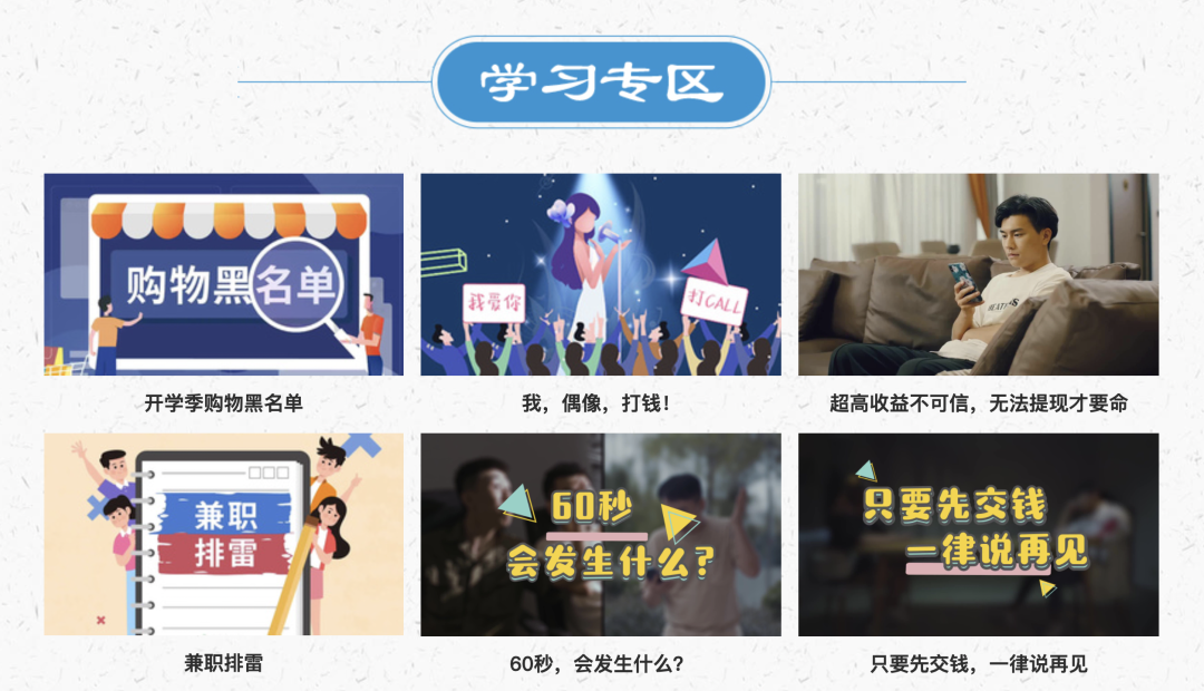 02 线上网络安全知识学习专区 10月11日至17日,教育部指导中国大学生在线、腾讯开设“守护青春 网络有你”网络安全知识学习专区,通过PC端、移动端双端口,以资讯、视频、系列微课等形式集中普及网络安全知识。师生可通过“中国大学生在线”微信公众号,点击菜单栏“守护青春”进入学习专区。