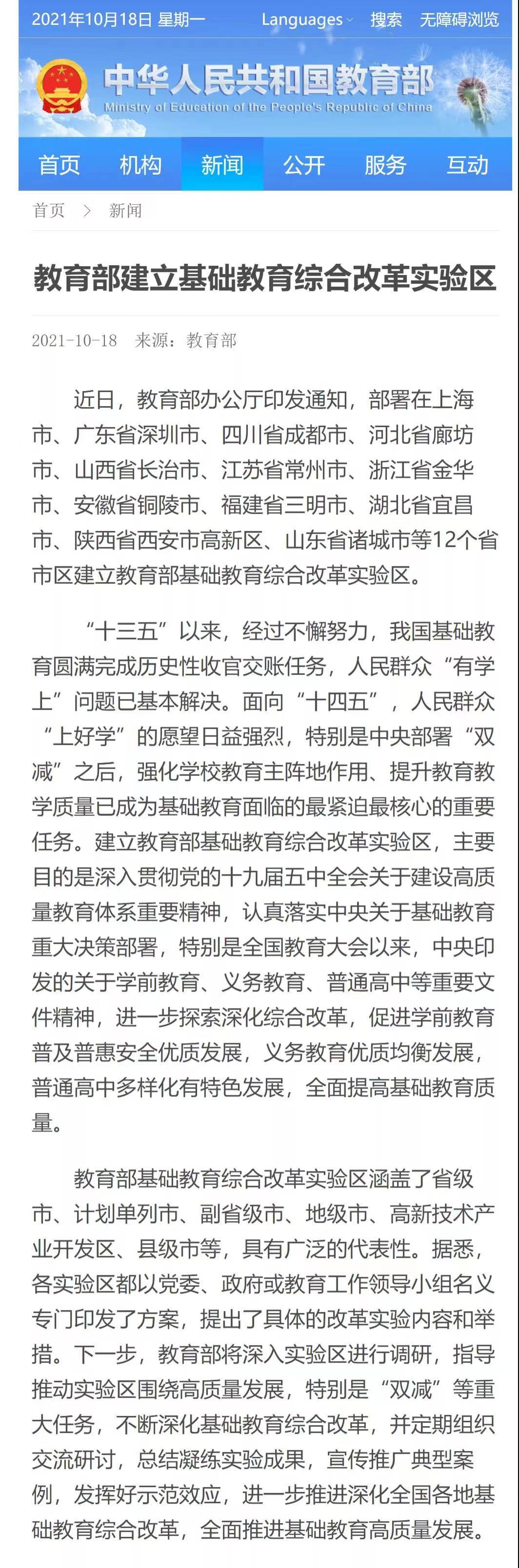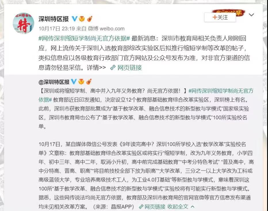 10月17日,某自媒体微信公号发表文章称:教育部基础教育综合改革实验区或将实行“缩短学制”。深圳市教育局相关负责人回应,网上流传关于深圳入选教育部综改实验区后拟推行缩短学制等改革的帖子,类似信息应以各级教育行政部门官方网站及公众号发布为准,对非官方渠道的信息请勿轻易采信。(深圳特区报微博) 成都市教育局辟谣实验区将缩短学制