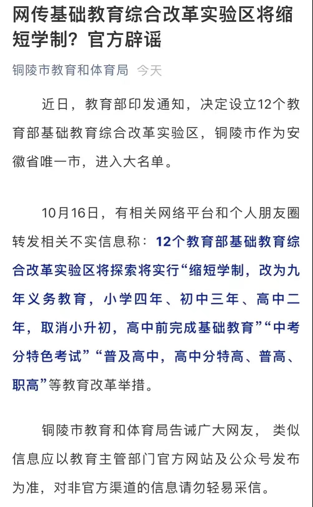 《教育部办公厅关于设立教育部基础教育综合改革实验区的通知》发布后,网传实验区将缩短学制等。对此,记者向成都市教育局相关工作人员核实,网上该说法并非事实。(四川观察微博) 网传12个基础教育综合改革实验区将缩短学制?浙江省教育厅辟谣 近日,多个自媒体微信公号发文称,我国将开始新一轮教育改革,日前公布的12个教育部基础教育综合改革实验区将探索实行“缩短学制,改为九年义务教育”等教育改革举措。记者登录教育部官网查询,并未发现网文中所提的任何改革举措。记者也第一时间采访了金华教育局,并以《金华入选!教育部公布12个基础教育综合改革实验区》为题,进行了报道。据报道,作为浙江省唯一入选教育部基础教育综合改革实验区的金华,已制定改革实施方案。全文均未提到要缩短学制、中考分特色考试等举措。18日上午,记者再次向浙江省教育厅及金华教育局进行求证。省教育厅和金华教育局相关处室均回复,“没听说此事”。(浙江新闻客户端) 网传基础教育综合改革实验区将缩短学制?安徽省铜陵市教体局官方辟谣
