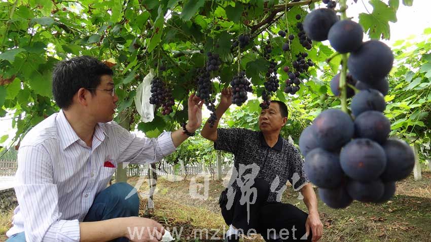 绵竹市现代农业科研所的技术专家(左)在年画村创意农业·水果示范园指导引进的优质葡萄新品种夏黑的田间管理