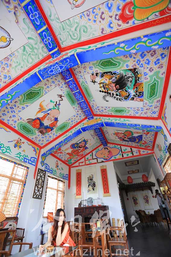 一名游客在年画村年画街坊品茶