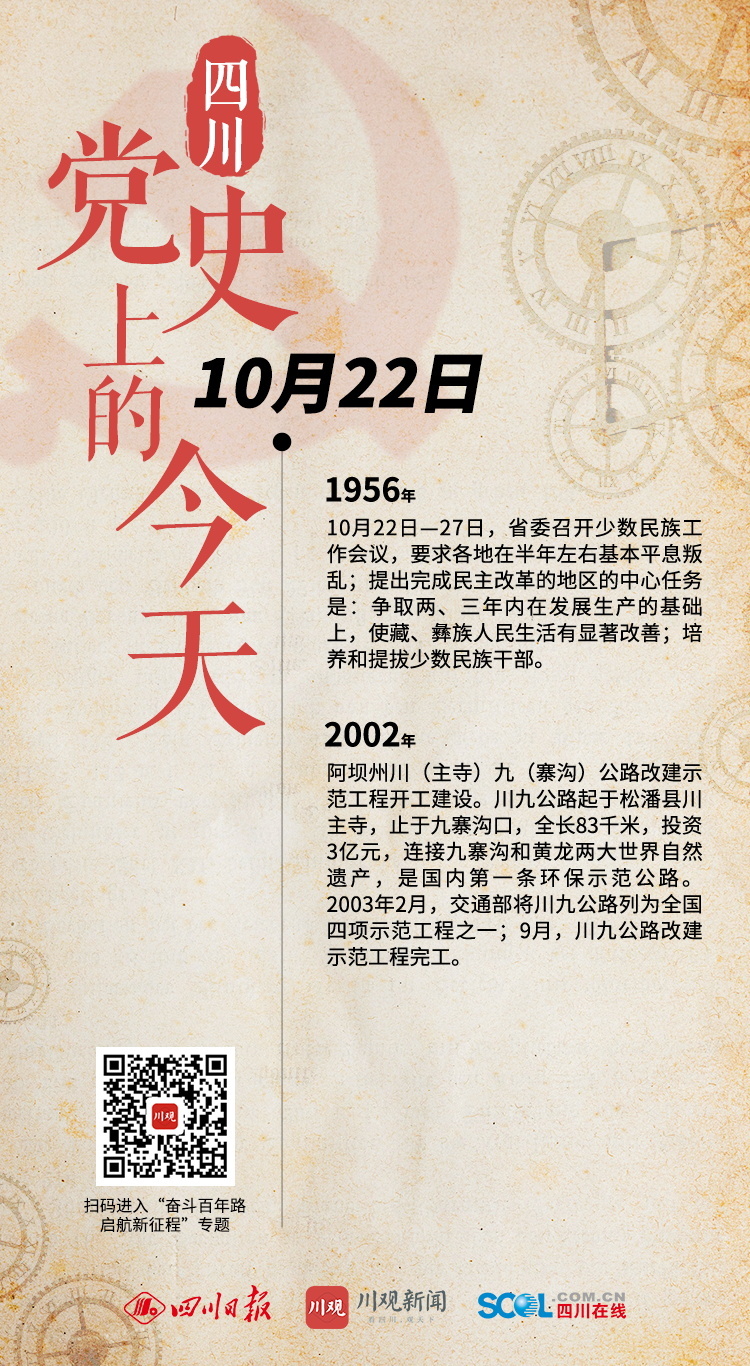 1956年 10月22日—27日,省委召开少数民族工作会议,要求各地在半年左右基本平息叛乱;提出完成民主改革的地区的中心任务是:争取两、三年内在发展生产的基础上,使藏、彝族人民生活有显著改善;培养和提拔少数民族干部。 2002年 阿坝州川(主寺)九(寨沟)公路改建示范工程开工建设。川九公路起于松潘县川主寺,止于九寨沟口,全长83千米,投资3亿元,连接九寨沟和黄龙两大世界自然遗产,是国内第一条环保示范公路。2003年2月,交通部将川九公路列为全国四项示范工程之一;9月,川九公路改建示范工程完工。