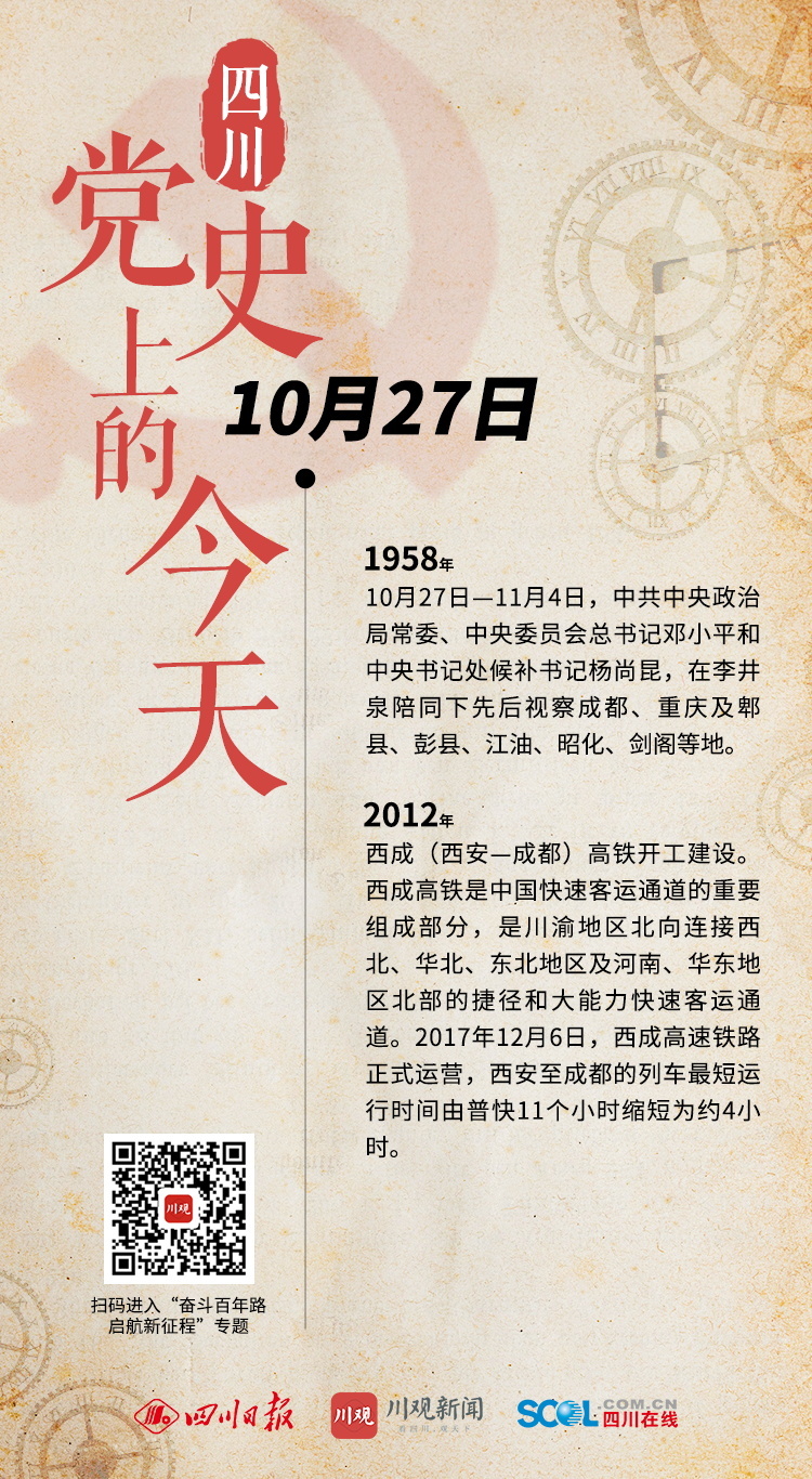 1958年 10月27日—11月4日,中共中央政治局常委、中央委员会总书记邓小平和中央书记处候补书记杨尚昆,在李井泉陪同下先后视察成都、重庆及郫县、彭县、江油、昭化、剑阁等地。 2012年 西成(西安—成都)高铁开工建设。西成高铁是中国快速客运通道的重要组成部分,是川渝地区北向连接西北、华北、东北地区及河南、华东地区北部的捷径和大能力快速客运通道。2017年12月6日,西成高速铁路正式运营,西安至成都的列车最短运行时间由普快11个小时缩短为约4小时。