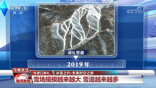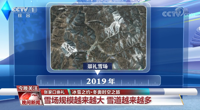 这是自然资源部国家基础地理信息中心提供的,由我们国家的卫星拍摄到的崇礼太子城区域的局部影像图,分辨率已经达到米级,可以清晰地看到地表变化。2016年的时候,我们能看到这里有滑雪场,只不过雪道不多,只有几条;而到了2018年,这里已经出现几家滑雪场了。而到了2019年,这些滑雪场的规模也更大了。