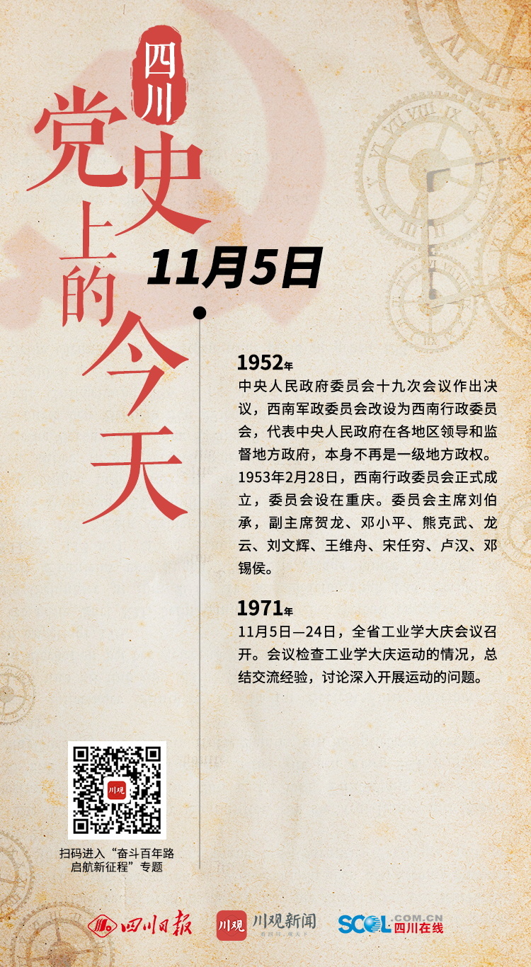 1952年 中央人民政府委员会十九次会议作出决议,西南军政委员会改设为西南行政委员会,代表中央人民政府在各地区领导和监督地方政府,本身不再是一级地方政权。1953年2月28日,西南行政委员会正式成立,委员会设在重庆。委员会主席刘伯承,副主席贺龙、邓小平、熊克武、龙云、刘文辉、王维舟、宋任穷、卢汉、邓锡侯。 1971年 11月5日—24日,全省工业学大庆会议召开。会议检查工业学大庆运动的情况,总结交流经验,讨论深入开展运动的问题。 (川观新闻记者 袁婧 整理)