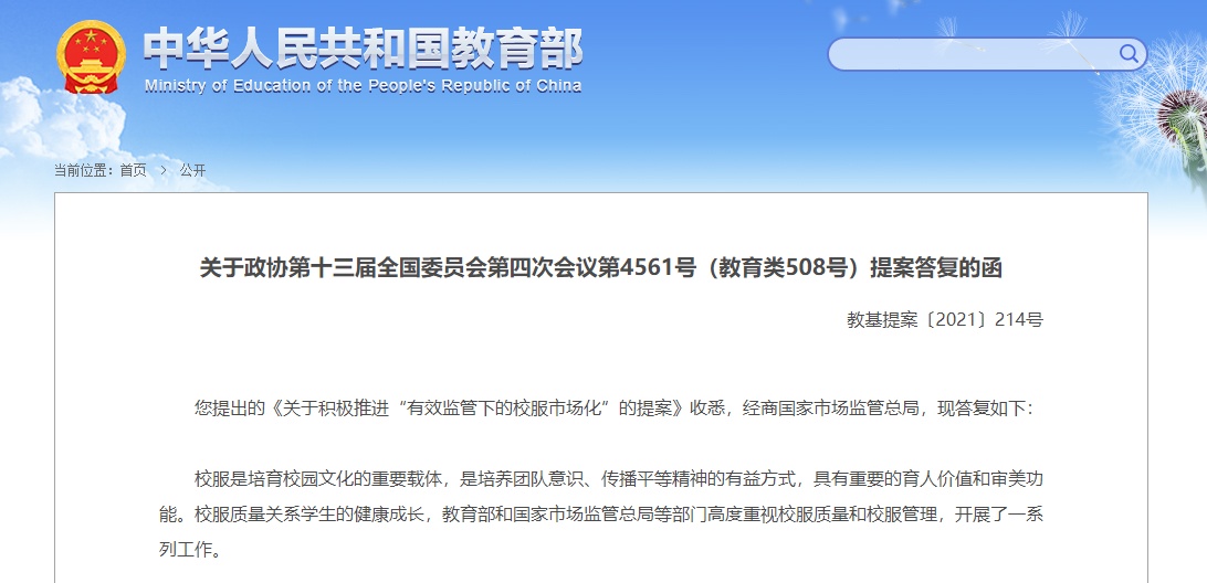 近日,教育部官网公布了《关于政协第十三届全国委员会第四次会议第4561号(教育类508号)提案答复的函》,对《关于积极推进“有效监管下的校服市场化”的提案》进行了答复。 教育部在答复中表示,下一步将会同有关部门进一步加强中小学生校服管理:规范中小学生校服选用采购工作,着力解决校服选用采购过程中出现的变相强制购买、价格偏高、款式品类过多、变动频繁、采购程序不规范等问题;继续加强校服产品的质量监管力度,持续开展儿童和学生用品安全守护行动,推进风险隐患排查,切实落实企业质量安全主体责任,多措并举开展质量技术帮扶;强化社会宣传引导,充分发挥家长、社会公众、新闻媒体等作用,深入开展消费品质量安全宣传工作;鼓励有条件的地区积极运用现代信息技术手段,探索建立校服信息管理服务长效机制。 教育部在答复中提到,教育部和国家市场监管总局等部门高度重视校服质量和校服管理,开展了一系列工作。如2015年6月,教育部等部门联合印发了《关于进一步加强中小学生校服管理工作的意见》,对规范校服市场、校服质量标准、校服质量检查、学校选用管理、校服采购管理及监督惩处机制等方面作了具体要求。 在市场监管方面,2019年以来,国家市场监管总局和各地市场监督管理部门持续开展儿童和学生用品守护行动,强化儿童穿戴用品质量监管,守护儿童穿戴安全,以监督抽查为抓手,覆盖生产流通全领域,强化中小企业儿童服装抽查力度,取得良好成效。2020年6月,国家市场监管总局等16部门联合印发了《关于印发<市场监管领域部门联合抽查事项清单(第一版)>的通知》,将包括校服等在内的中小学教育装备产品纳入抽查事项,开展部门联合“双随机、一公开”监管。 2020年,全国市场监管部门执法稽查机构在开展校服执法行动中,共出动执法人员18081人(次),查处违法案件126起,涉案货值139.12万元。 来源:央视新闻 |