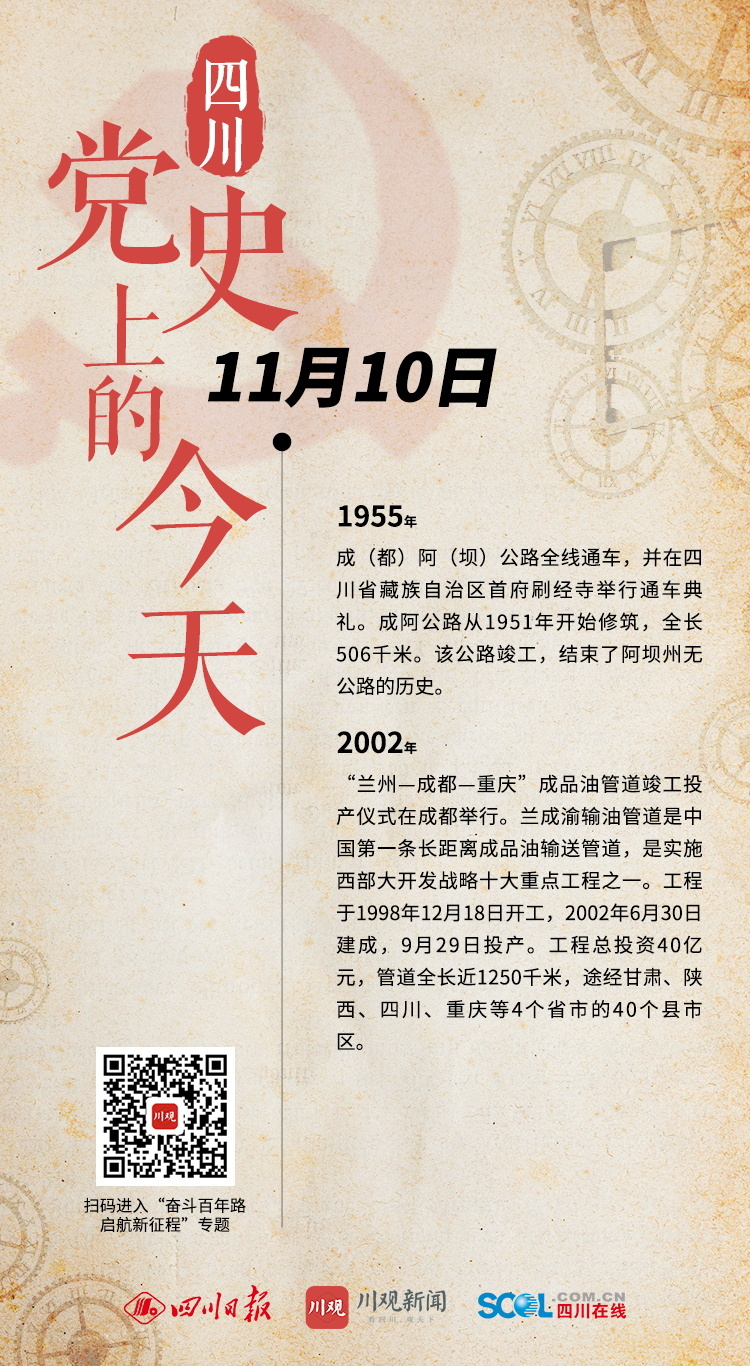 1955年 成(都)阿(坝)公路全线通车,并在四川省藏族自治区首府刷经寺举行通车典礼。成阿公路从1951年开始修筑,全长506千米。该公路竣工,结束了阿坝州无公路的历史。 2002年 “兰州—成都—重庆”成品油管道竣工投产仪式在成都举行。兰成渝输油管道是中国第一条长距离成品油输送管道,是实施西部大开发战略十大重点工程之一。工程于1998年12月18日开工,2002年6月30日建成,9月29日投产。工程总投资40亿元,管道全长近1250千米,途经甘肃、陕西、四川、重庆等4个省市的40个县市区。 (川观新闻记者 袁婧 整理)