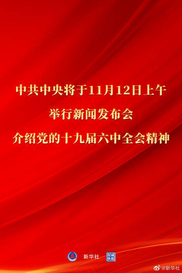 中共中央将于11月12日上午10时举行新闻发布会,介绍党的十九届六中全会精神。中央广播电视总台及人民网、新华网、中国网等将对新闻发布会进行直播。