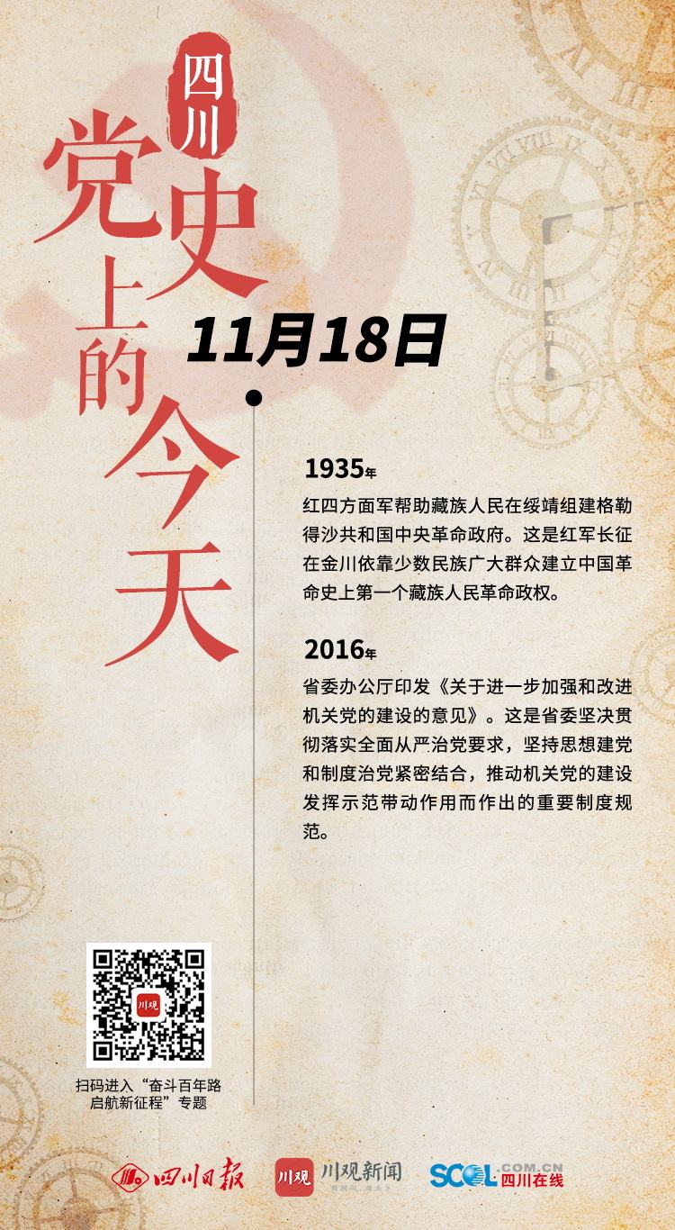 1935年 红四方面军帮助藏族人民在绥靖组建格勒得沙共和国中央革命政府。这是红军长征在金川依靠少数民族广大群众建立中国革命史上第一个藏族人民革命政权。 2016年 省委办公厅印发《关于进一步加强和改进机关党的建设的意见》。这是省委坚决贯彻落实全面从严治党要求,坚持思想建党和制度治党紧密结合,推动机关党的建设发挥示范带动作用而作出的重要制度规范。 来源:川观新闻 |