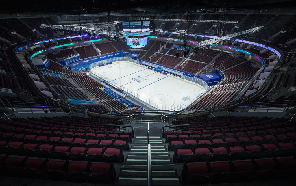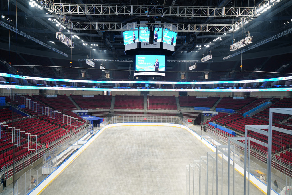 五棵松体育中心内景 组委会供图 冰篮转换,6小时极限操作 关于怎样在短时间内实现“冰篮转换”,五棵松体育馆方面介绍,冰球比赛场地在制冰前夕,需先围绕场地安装高度为9厘米的冰坝。 冰坝的主要作用是用来承载冰球比赛场地的界墙,以实现界墙的快速拆装,同时也兼顾着在制冰时把水拦在场地里。 安装完冰坝与界墙后,就需要对场地表面的混凝土进行降温处理,场地下方预埋了制冷管道,只需要将制冰机组启动即可对地面进行降温处理。