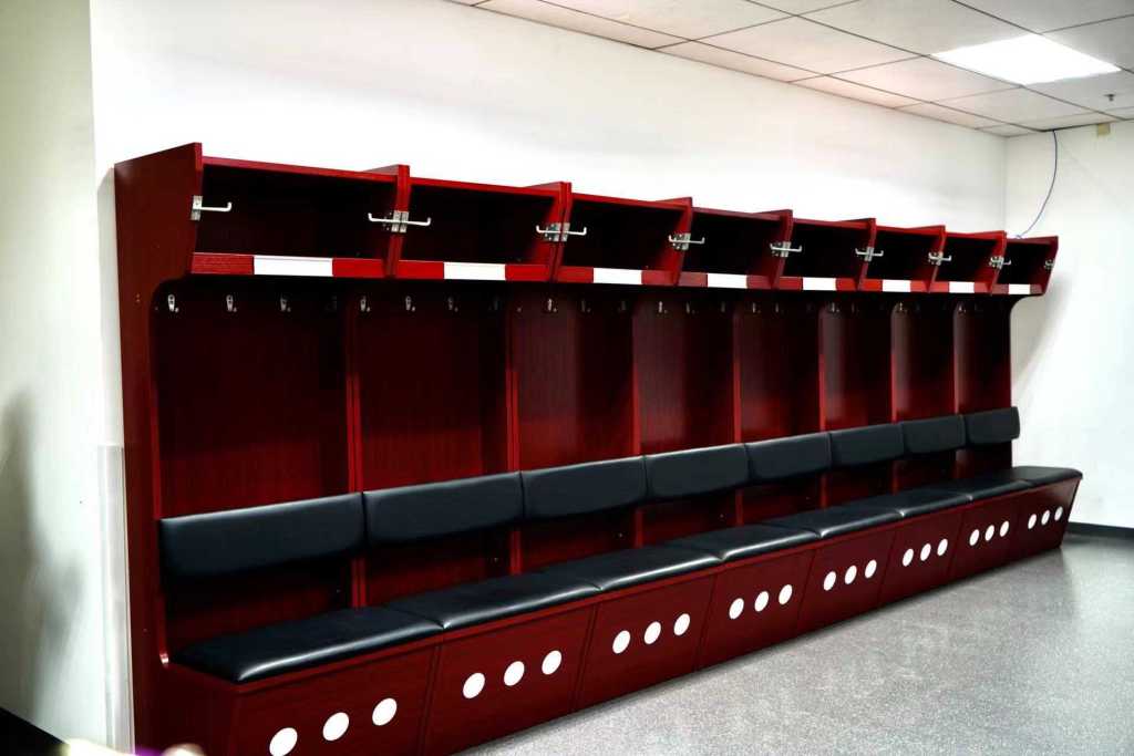 看台 在所有更衣室区域有三个隔断是比较特殊的,它的面积更大,是护具庞大的守门员用来更衣的。守门员更衣区宽度达到了1米,而其他球员的更衣区域仅为80厘米。 在更衣柜下方座椅下边缘,斜向设计为穿着冰刀的运动员留出了更大空间,避免冰刀损坏更衣柜,也更方便运动员穿脱装备。此外,更衣柜座椅下方还留有三个通风孔,因为冰球运动对抗激烈,运动员会出很多汗,通风孔会起到通风透气的作用。