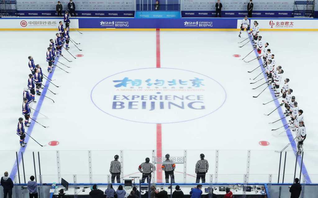 “相约北京”冰球测试赛 组委会供图 冰球场制冰的理想温度是在-8℃至-6℃之间,只有将温度降到合适后,才可以正式开始制冰工作。 对场地表面降温完成后,即可进行第一步制冰工作,首先要制一层厚5毫米至1厘米的基础冰;接下来喷白色冰漆,连续喷4遍,直到冰面看上去洁白无瑕;白漆喷好后,再制一层5毫米厚的冰面,并在冰面上进行画线和贴赛事Logo的工作。 这些让场地看上去更加漂亮的红线、蓝线——无论是笔直的球门线,还是圆形的争球圈,都是制冰师傅依靠简单的尼龙绳等辅助工具纯手工完成。一般完成画线与铺LOGO的工作,需要6小时左右的时间;画完线与铺完Logo后再制作2—2.5厘米的冰面,将线和Logo“冰封”起来。 到此,制冰工作基本完成,整个冰层厚度大约4厘米。