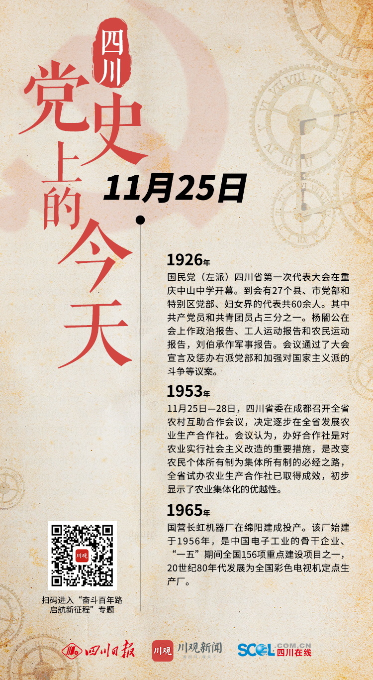 1926年 国民党(左派)四川省第一次代表大会在重庆中山中学开幕。到会有27个县、市党部和特别区党部、妇女界的代表共60余人。其中共产党员和共青团员占三分之一。杨闇公在会上作政治报告、工人运动报告和农民运动报告,刘伯承作军事报告。会议通过了大会宣言及惩办右派党部和加强对国家主义派的斗争等议案。 1953年 11月25日—28日,四川省委在成都召开全省农村互助合作会议,决定逐步在全省发展农业生产合作社。会议认为,办好合作社是对农业实行社会主义改造的重要措施,是改变农民个体所有制为集体所有制的必经之路,全省试办农业生产合作社已取得成效,初步显示了农业集体化的优越性。 1965年 国营长虹机器厂在绵阳建成投产。该厂始建于1956年,是中国电子工业的骨干企业、“一五”期间全国156项重点建设项目之一,20世纪80年代发展为全国彩色电视机定点生产厂。 来源:川观新闻 |