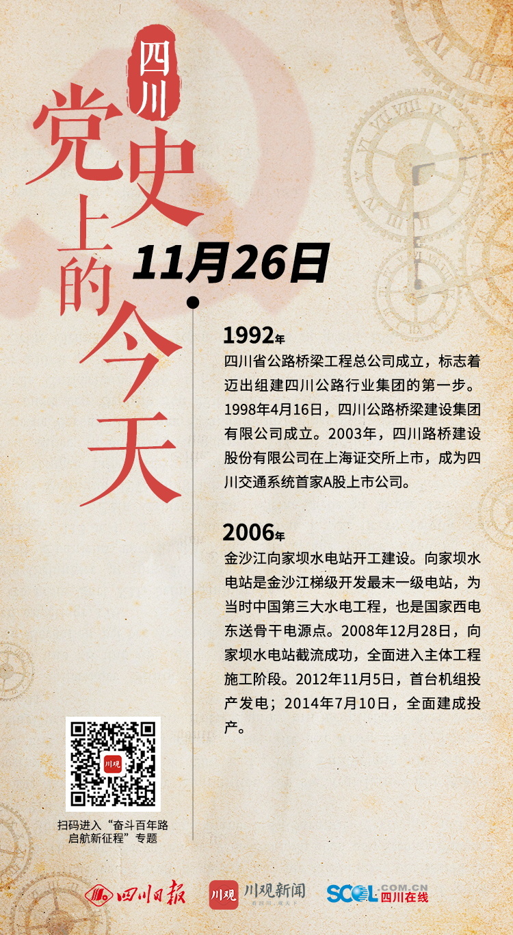 1992年 四川省公路桥梁工程总公司成立,标志着迈出组建四川公路行业集团的第一步。1998年4月16日,四川公路桥梁建设集团有限公司成立。2003年,四川路桥建设股份有限公司在上海证交所上市,成为四川交通系统首家A股上市公司。 2006年 金沙江向家坝水电站开工建设。向家坝水电站是金沙江梯级开发最末一级电站,为当时中国第三大水电工程,也是国家西电东送骨干电源点。2008年12月28日,向家坝水电站截流成功,全面进入主体工程施工阶段。2012年11月5日,首台机组投产发电;2014年7月10日,全面建成投产。 (川观新闻记者 袁婧 整理)