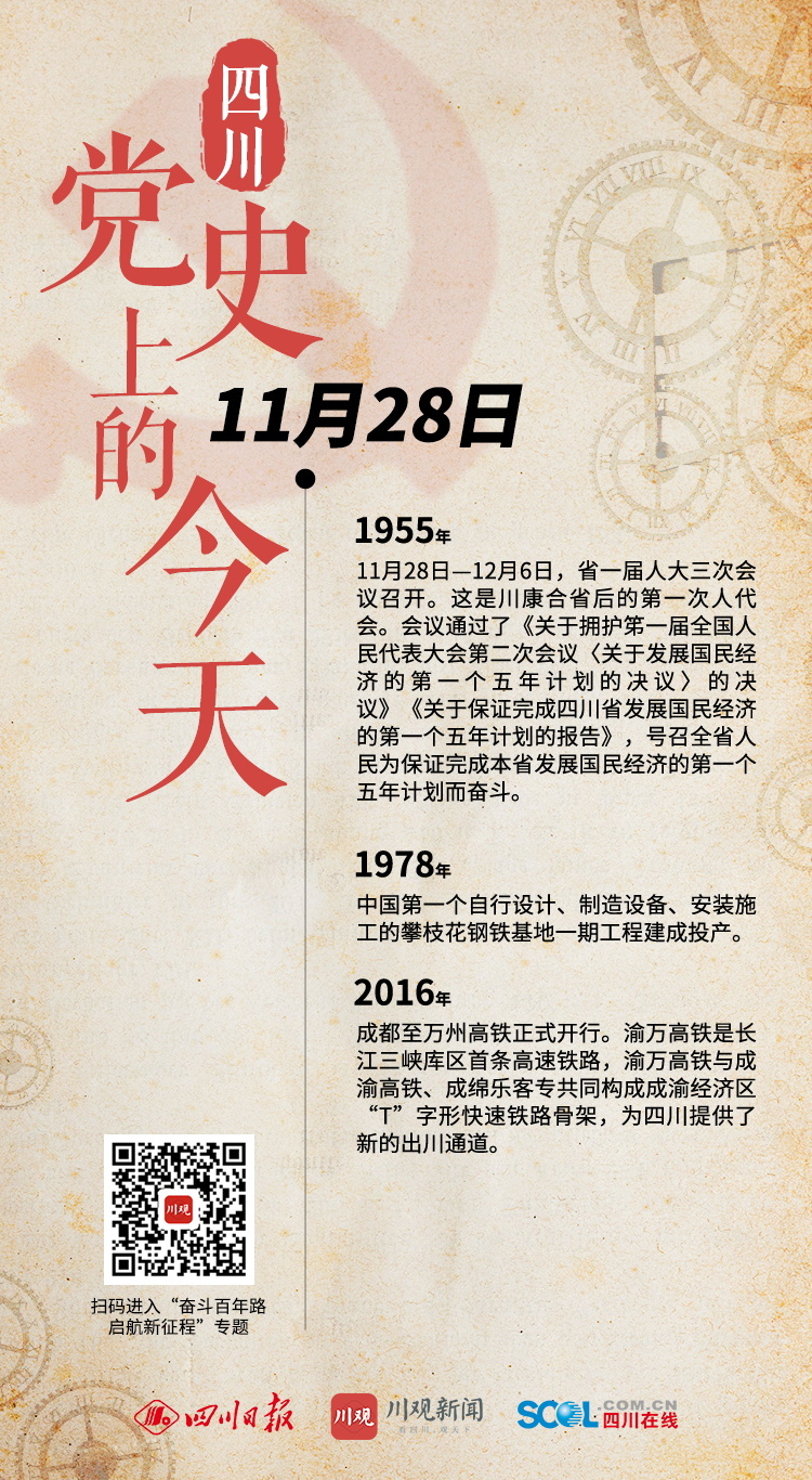 1955年 11月28日—12月6日,省一届人大三次会议召开。这是川康合省后的第一次人代会。会议通过了《关于拥护笫一届全国人民代表大会第二次会议〈关于发展国民经济的第一个五年计划的决议〉的决议》《关于保证完成四川省发展国民经济的第一个五年计划的报告》,号召全省人民为保证完成本省发展国民经济的第一个五年计划而奋斗。 1978年 中国第一个自行设计、制造设备、安装施工的攀枝花钢铁基地一期工程建成投产。 2016年 成都至万州高铁正式开行。渝万高铁是长江三峡库区首条高速铁路,渝万高铁与成渝高铁、成绵乐客专共同构成成渝经济区“T”字形快速铁路骨架,为四川提供了新的出川通道。 (川观新闻记者 袁婧 整理)