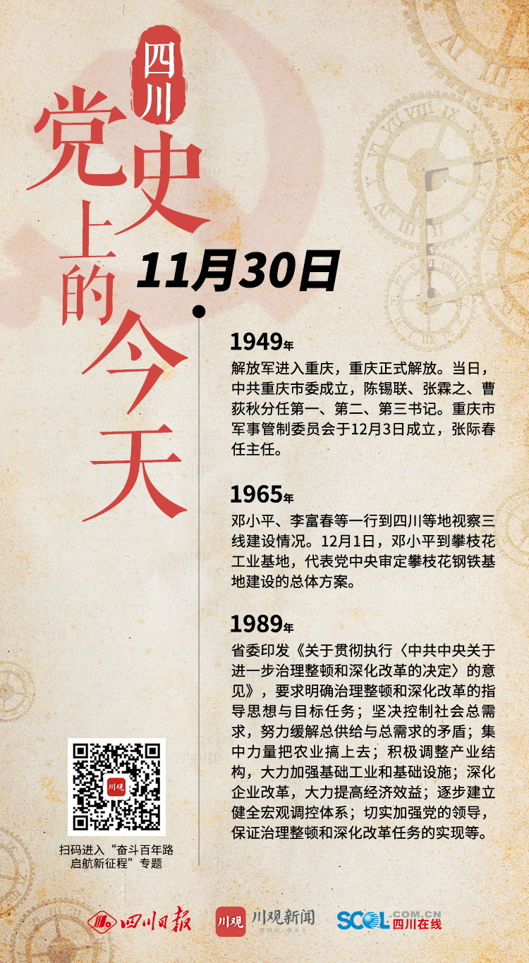 1949年 解放军进入重庆,重庆正式解放。当日,中共重庆市委成立,陈锡联、张霖之、曹荻秋分任第一、第二、第三书记。重庆市军事管制委员会于12月3日成立,张际春任主任。 1965年 邓小平、李富春等一行到四川等地视察三线建设情况。12月1日,邓小平到攀枝花工业基地,代表党中央审定攀枝花钢铁基地建设的总体方案。 1989年 省委印发《关于贯彻执行〈中共中央关于进一步治理整顿和深化改革的决定〉的意见》,要求明确治理整顿和深化改革的指导思想与目标任务;坚决控制社会总需求,努力缓解总供给与总需求的矛盾;集中力量把农业搞上去;积极调整产业结构,大力加强基础工业和基础设施;深化企业改革,大力提高经济效益;逐步建立健全宏观调控体系;切实加强党的领导,保证治理整顿和深化改革任务的实现等。 来源:川观新闻 |
