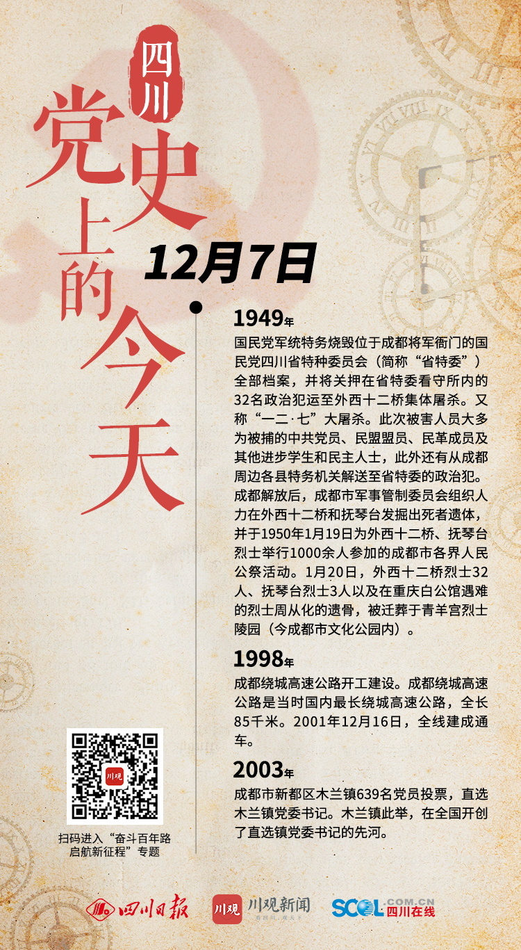 1949年 国民党军统特务烧毁位于成都将军衙门的国民党四川省特种委员会(简称“省特委”)全部档案,并将关押在省特委看守所内的32名政治犯运至外西十二桥集体屠杀。又称“一二·七”大屠杀。此次被害人员大多为被捕的中共党员、民盟盟员、民革成员及其他进步学生和民主人士,此外还有从成都周边各县特务机关解送至省特委的政治犯。成都解放后,成都市军事管制委员会组织人力在外西十二桥和抚琴台发掘出死者遗体,并于1950年1月19日为外西十二桥、抚琴台烈士举行1000余人参加的成都市各界人民公祭活动。1月20日,外西十二桥烈士32人、抚琴台烈士3人以及在重庆白公馆遇难的烈士周从化的遗骨,被迁葬于青羊宫烈士陵园(今成都市文化公园内)。 1998年 成都绕城高速公路开工建设。成都绕城高速公路是当时国内最长绕城高速公路,全长85千米。2001年12月16日,全线建成通车。 2003年 成都市新都区木兰镇639名党员投票,直选木兰镇党委书记。木兰镇此举,在全国开创了直选镇党委书记的先河。 (川观新闻记者 袁婧 整理)