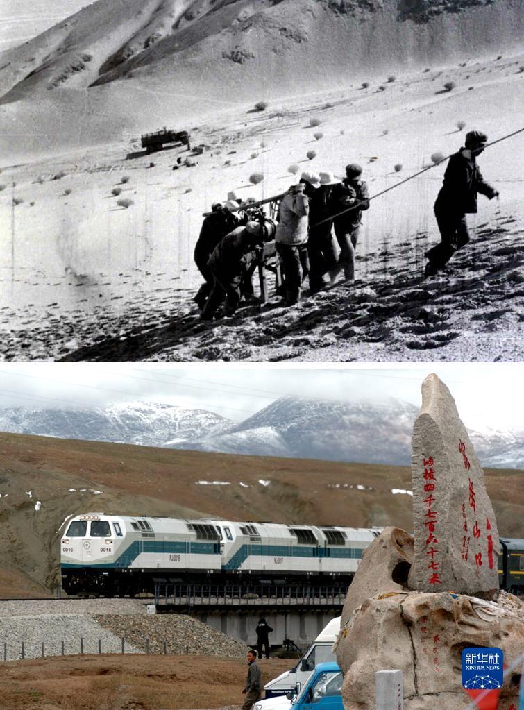 拼版照片:上图为20世纪50年代拍摄的勘测青藏线的资料照片;下图为2006年7月1日,青藏铁路全线通车,这是从格尔木出发的“青1”次列车经过海拔4767米的昆仑山口(新华社记者 侯德强 摄)。新华社发 70年前,新中国动用4万多峰骆驼向西藏运输物资,平均行进1公里,就要消耗12具“沙漠之舟”。 如今,一条钢铁“天路”绵延千里,列车一日便达,为雪域高原送来安康。 苍茫雪域,巍峨昆仑,见证了世界铁路建设史上的奇迹。青藏铁路,催生出“挑战极限,勇创一流”的青藏铁路精神。 2020年11月,习近平总书记对川藏铁路开工建设作出重要指示强调,广大铁路建设者要发扬“两路”精神和青藏铁路精神,科学施工、安全施工、绿色施工,高质量推进工程建设,为全面建设社会主义现代化国家作出新的贡献。