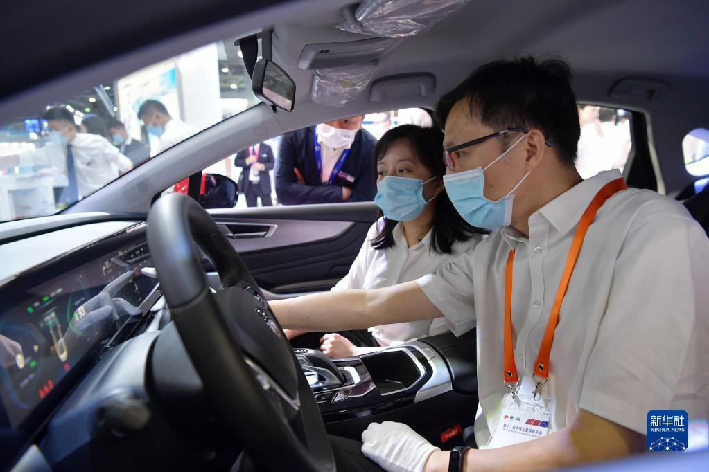 观众在第十二届中国卫星导航成就博览会上参观体验基于北斗卫星导航系统应用的电动车(5月26日摄)。新华社记者 彭昭之 摄