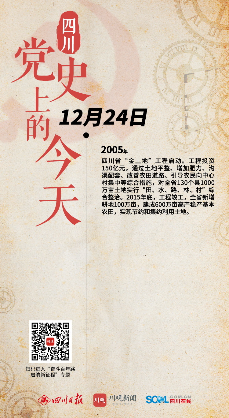 2005年 四川省“金土地”工程启动。工程投资150亿元,通过土地平整、增加肥力、沟渠配套、改善农田道路、引导农民向中心村集中等综合措施,对全省130个县1000万亩土地实行“田、水、路、林、村”综合整治。2015年底,工程竣工,全省新增耕地100万亩,建成600万亩高产稳产基本农田,实现节约和集约利用土地。 (川观新闻记者 袁婧 整理)