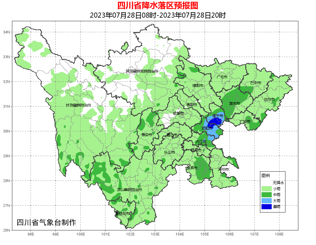 盆地大部阴天间多云有阵雨或雷雨,其中绵阳、德阳、成都、南充、广安、遂宁、资阳、内江、泸州9市的部分地方有大雨到暴雨,局部大暴雨,个别地方特大暴雨;川西高原北部以多云天气为主,川西高原其余地方和攀西地区阴天间多云有阵雨或雷雨,其中甘孜州西南部和攀西地区西部南部有中雨。